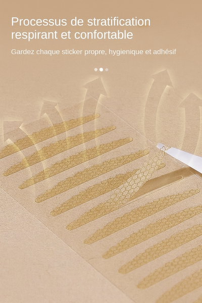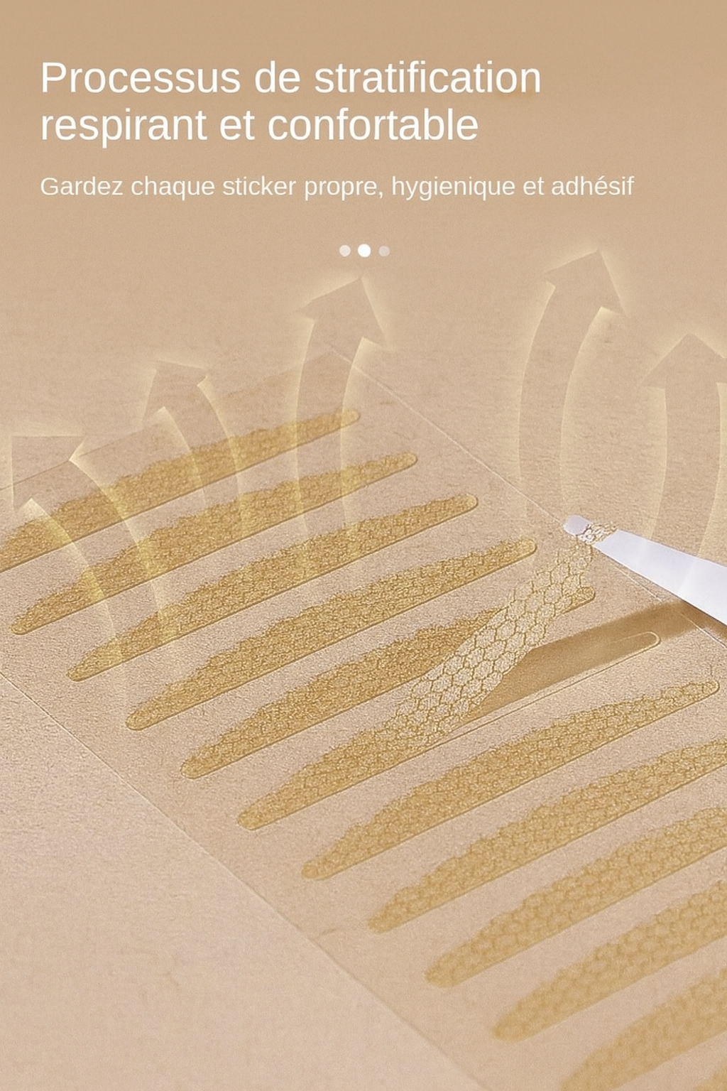 Ces bandes ont été spécialement pensées pour celles (et ceux) qui veulent un résultat visible, immédiat et naturel. Grâce à une technologie adhésive double-face de précision, elles maintiennent parfaitement la paupière tout au long de la journée, même sous le maquillage. Que vous ayez des paupières tombantes, asymétriques ou un monolide, elles permettent de créer un pli net, symétrique et durable, sans douleur, sans risque, et sans compétences particulières.